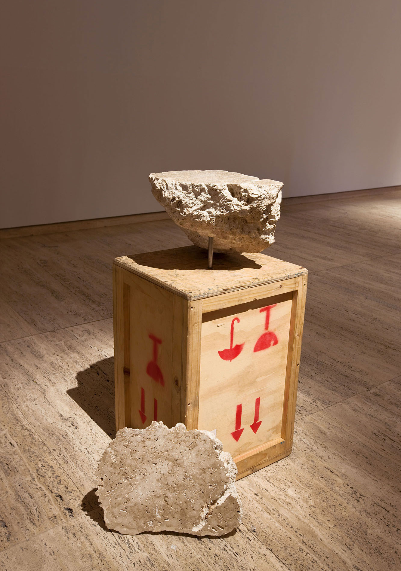 Nicholas Mangan, Proposition for Dowiyogo’s Ancient Coral Coffee Table, 2009, coral limestone from the island of Nauru, wooden travel crate, 60 × 60 × 95 cm. Installation detail, Between a Rock and a Hard Place, Art Gallery of New South Wales, Sydney, 2009. Photographer: Carley Wright.
